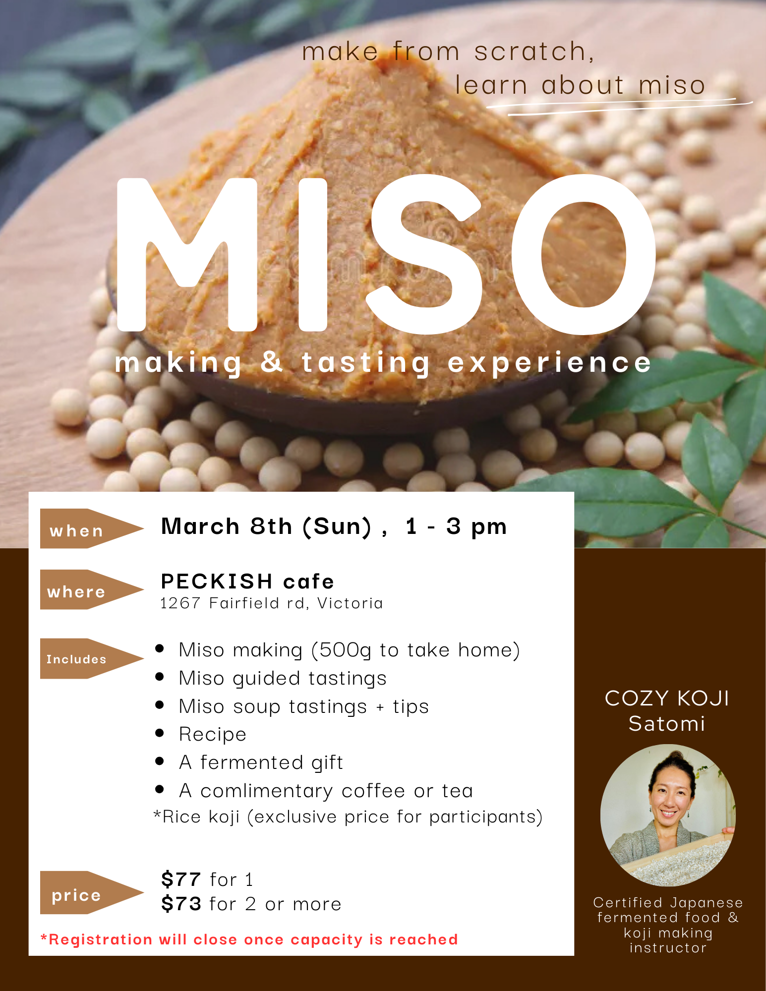 Discover the comfort and creativity of miso making in this hands‑on workshop at the cozy PECKISH Café on Fairfield. You’ll learn the fundamentals of traditional miso, explore its flavours through guided tastings, and head home with your own freshly made batch.