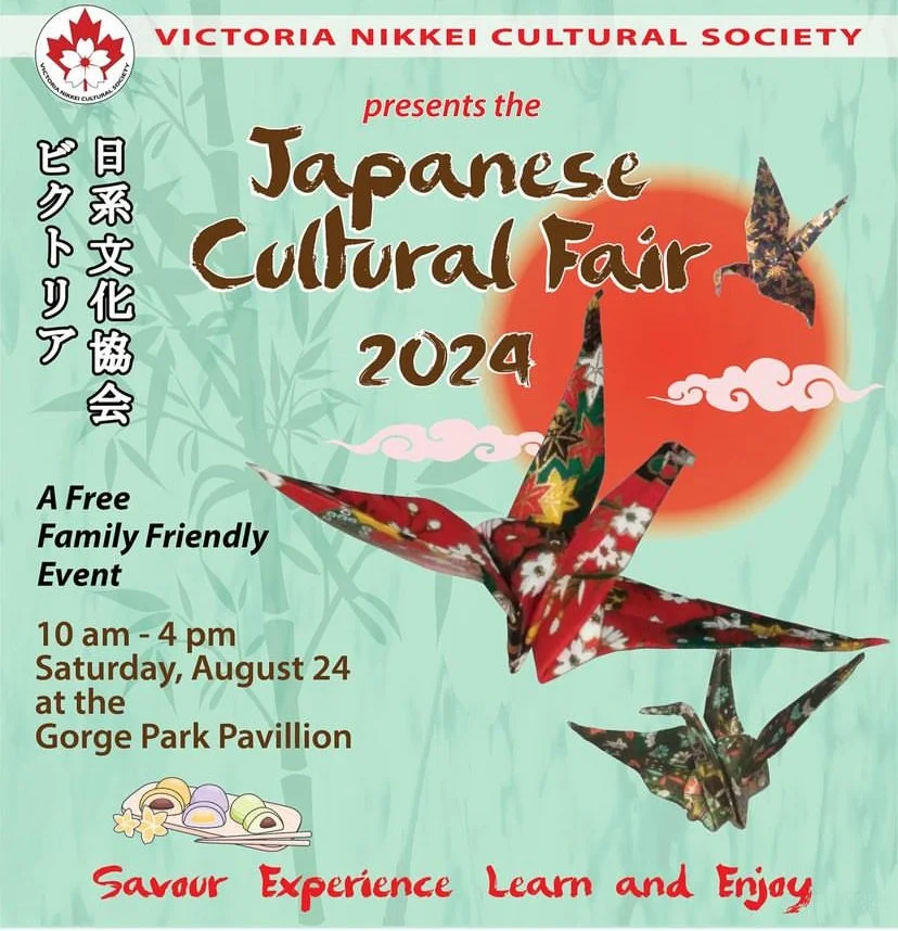 Back to All Events Japanese Cultural Fair Saturday, August 24, 2024 10:00 AM 4:00 PM Gorge Park Pavilion 1070 Tillicum Road Victoria, BC, V9A 1M9 Canada (map) Google Calendar ICS 2024 VNCS Japanese Cultural Fair – Saturday, August 24th – VNCS