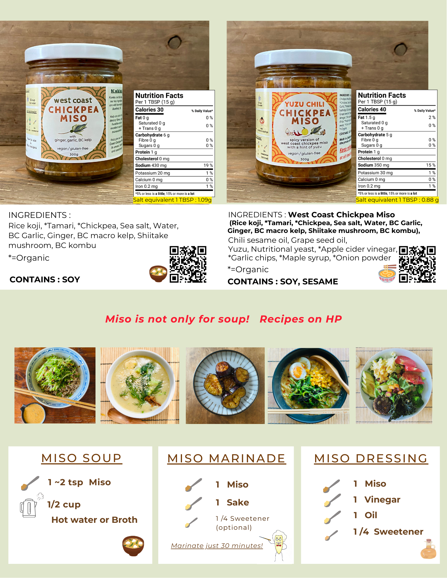 <Ingredients> West coast chickpea miso, (Rice koji, *Tamari, *Chickpea, Sea salt, Water, BC Garlic, Ginger, BC macro kelp, Shiitake mushroom, BC kombu), Chili sesame oil, Grape seed oil, Yuzu, Nutritional yeast, *Apple cider vinegar, *Garlic chips, *Maple syrup, *Onion powder *=Organic